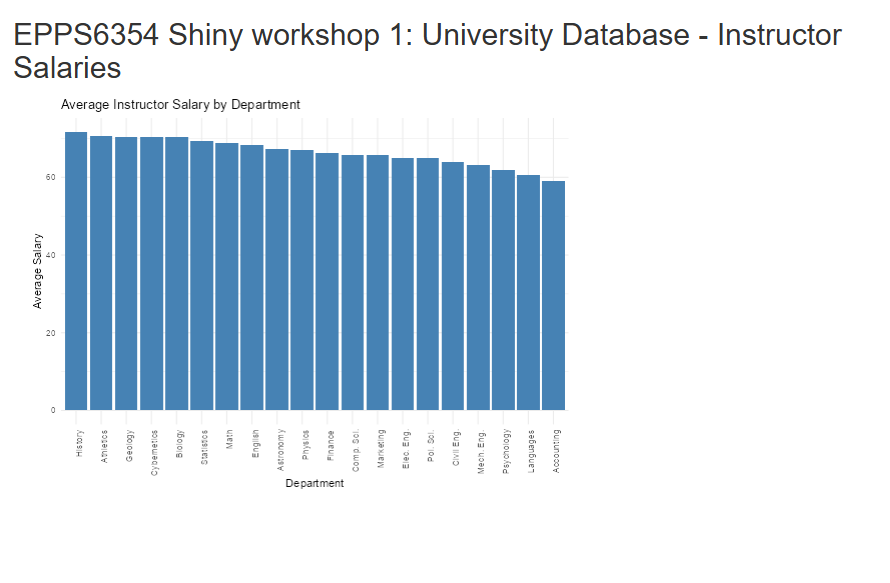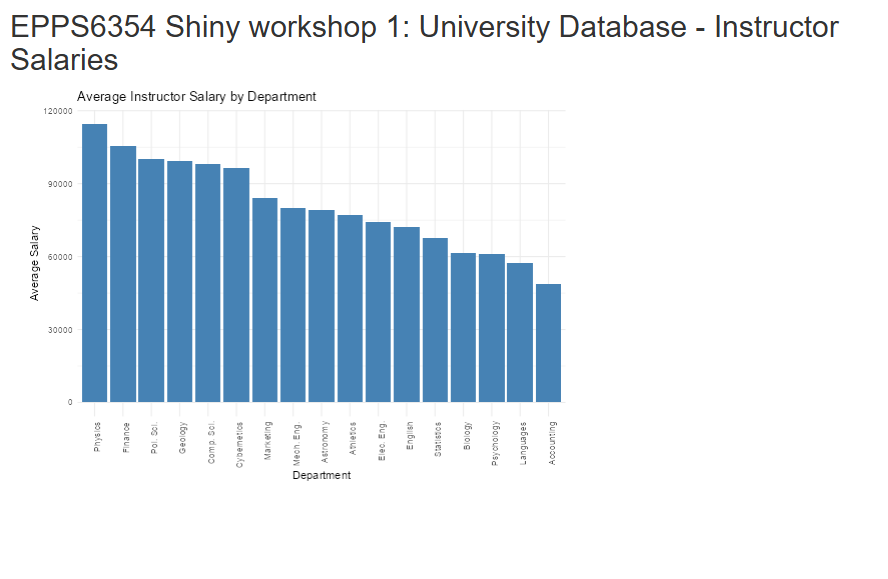 For the first Shiny application, I ran the app.R file in the Lab/R/Shiny/1 Teams folder and entered my PostgreSQL password so the application could connect to my local university database. The app successfully displayed average instructor salary by department.